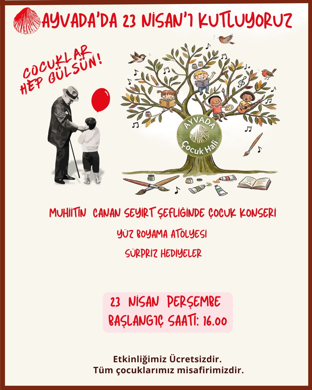 Atölye Ayvada’da 23 Nisan coşkusunu birlikte kutluyoruz. Çocuklarımız için müzik, yüz boyama ve sürpriz hediyelerle dolu bir gün!