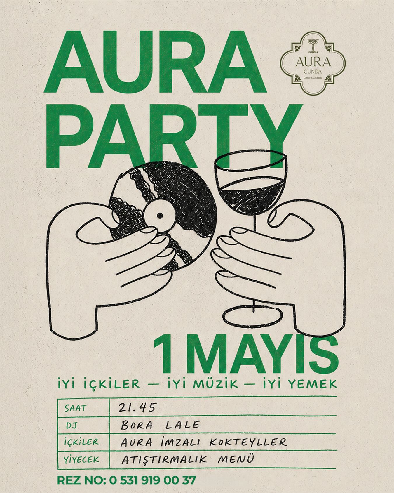 1 Mayıs akşamı Bora Lale’nin setleriyle harika bir “Aura Party” seni bekliyor. Müziğin ritmine imza kokteyllerimiz ve lezzetli atıştırmalıklarımız eşlik edecek.
