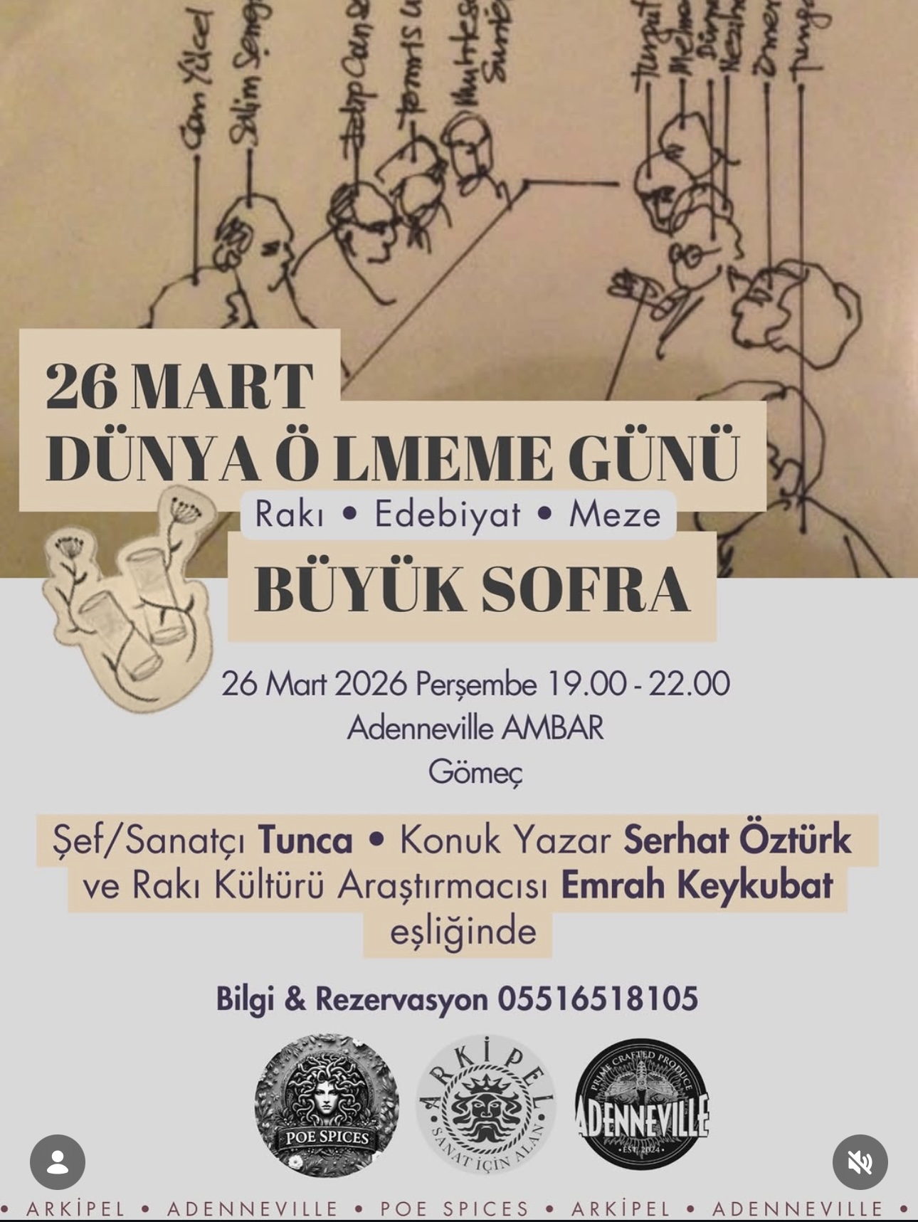Şeker gibi bir buluşma yakında! 26 Mart Dünya Ölmememe Günü’nde rakı, meze ve edebiyat aynı masada buluşuyor. Gömeç’in yüzyıllık ambarında sözlerin, kadehlerin ve hikâyelerin çoğaldığı bu özel akşamda birlikte “ölmemeyi” kutluyoruz.