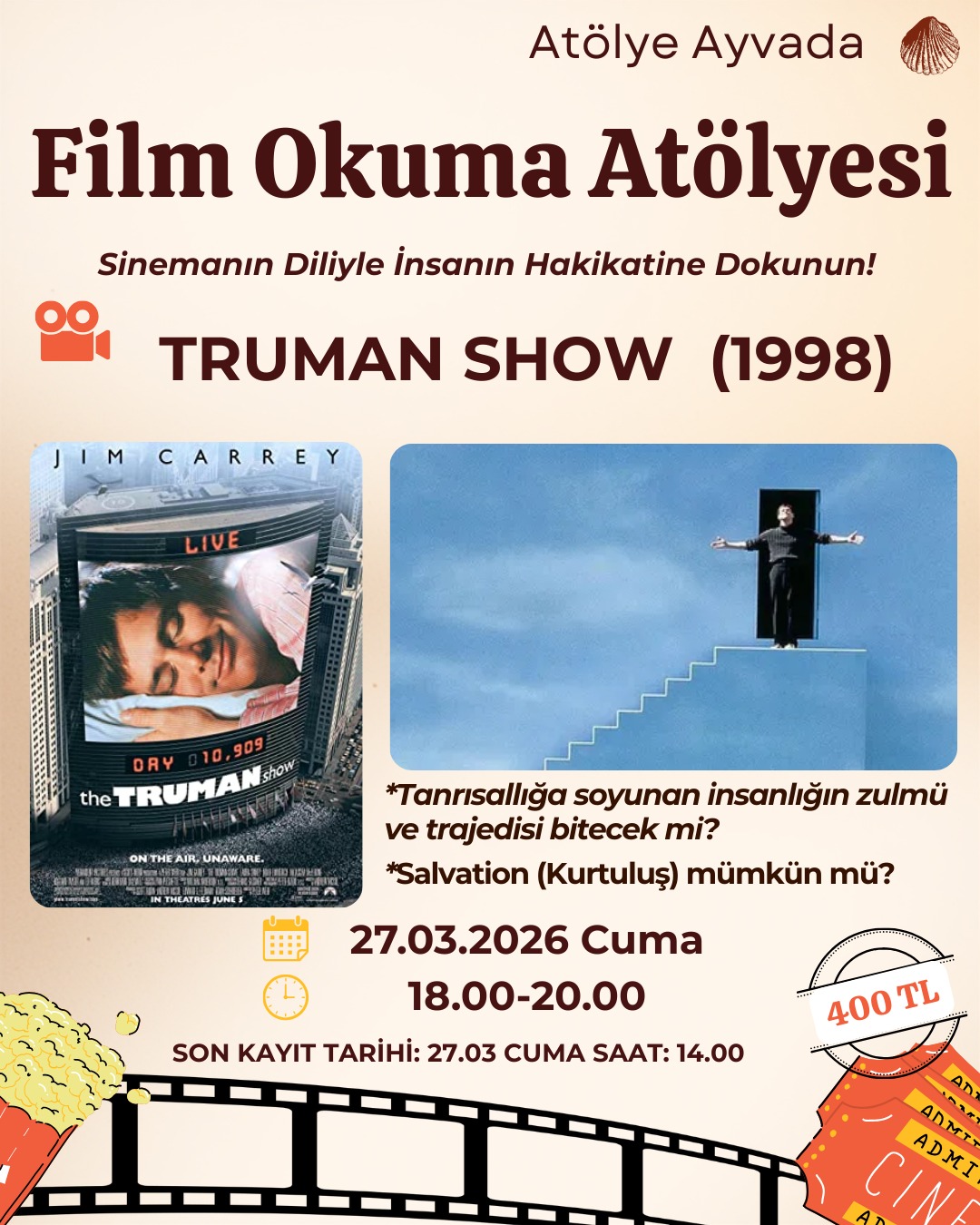 Sinemanın diliyle insanın hakikatine dokunmaya hazır olun! Mustafa Akbulut’un yönlendirmesiyle gerçekleşecek bu atölyede, Truman Show filmi üzerinden sahnelerin ardındaki düşünce, duygu ve derinlik keşfedilecek.
