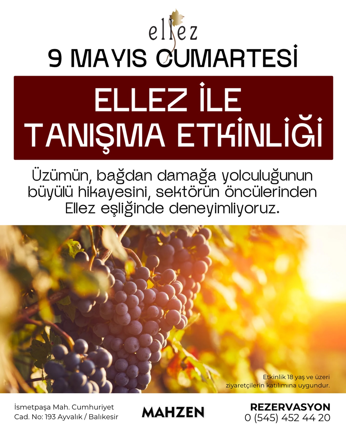 - 📍 Yer: Mahzen Ayvalık Şarapevi, İsmetpaşa Mah. Cumhuriyet Cad. No:193 Ayvalık / Balıkesir