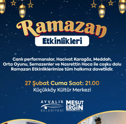 "Ramazan’ın bereketini ve paylaşmanın güzelliğini birlikte yaşamaya devam ediyoruz.Canlı performanslar, Hacivat Karagöz, meddah, orta oyunu, semazenler ve Nasrettin Hoca ile dolu dolu bir Ramazan akşamında buluşuyoruz.📍 27 Şubat Cuma 🕘 Saat: 21.00 📌 Küçükköy Kültür MerkeziTüm hemşehrilerimizi bu güzel Ramazan akşamında bir araya gelmeye davet ediyorum.".